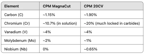 CPM MagnaCut, on the other hand, uses a balanced mix of carbon, nitrogen, vanadium, and chromium, carefully optimized to maintain stainless properties while eliminating large chromium carbides. This means more chromium stays in solution to fight corrosion, all without sacrificing hardness or durability.