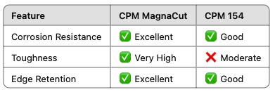 Verdict: CPM MagnaCut surpasses CPM 154 in toughness and overall performance, making it a stronger candidate for demanding environments.