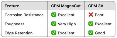 If your use-case involves frequent exposure to moisture, sweat, or salt—and you still need high toughness—CPM MagnaCut is the better all-around choice. For maximum impact toughness in controlled environments (or if rust isn’t a concern), CPM 3V still has the edge.