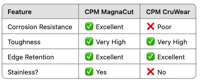 Verdict: MagnaCut offers all the toughness of CruWear with the added advantage of being stainless—making it a better choice for outdoor or marine environments.