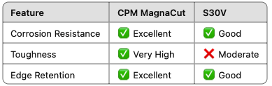 Verdict: S30V remains solid, but MagnaCut is an evolution with improved toughness and edge stability.