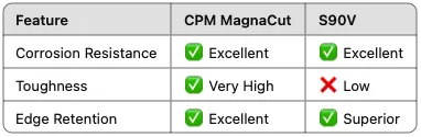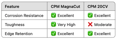 If you prioritize absolute edge retention and operate in lower-stress environments, CPM 20CV remains a solid option. However, for users who want a balanced combination of corrosion resistance, edge retention, and high toughness, CPM MagnaCut offers more flexibility and real-world resilience.