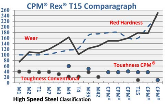 CPM® Rex® T15 (HS) is a super high speed steel made by the CPM® process. It is a tungsten type high speed containing high vanadium for excellent abrasion resistance, and cobalt for good red hardness. CPM® Rex® T15 is ideal for cutting difficult to machine materials where high frictional heating is encountered.