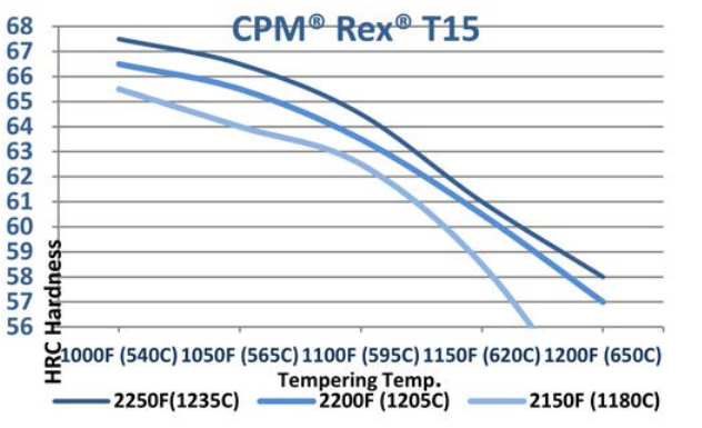 | Tempering Temp. | 2125°F (1165°C) | 2150°F (1180°C) | 2175°F (1190°C) | 2200°F (1205°C) | 2225°F (1220°C) | 2250°F (1235°C) |